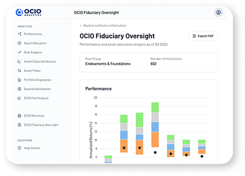 OCIO Fiduciary Oversight is designed to support governance, monitoring, and documentation of OCIO relationships. It helps you evaluate providers against fiduciary criteria and track oversight activities over time. OCIO Analytics, by contrast, is focused on deeper quantitative analysis, including performance, asset allocation, and peer benchmarking. Fiduciary Oversight complements OCIO Analytics by providing a structured framework for ongoing evaluation and governance processes.